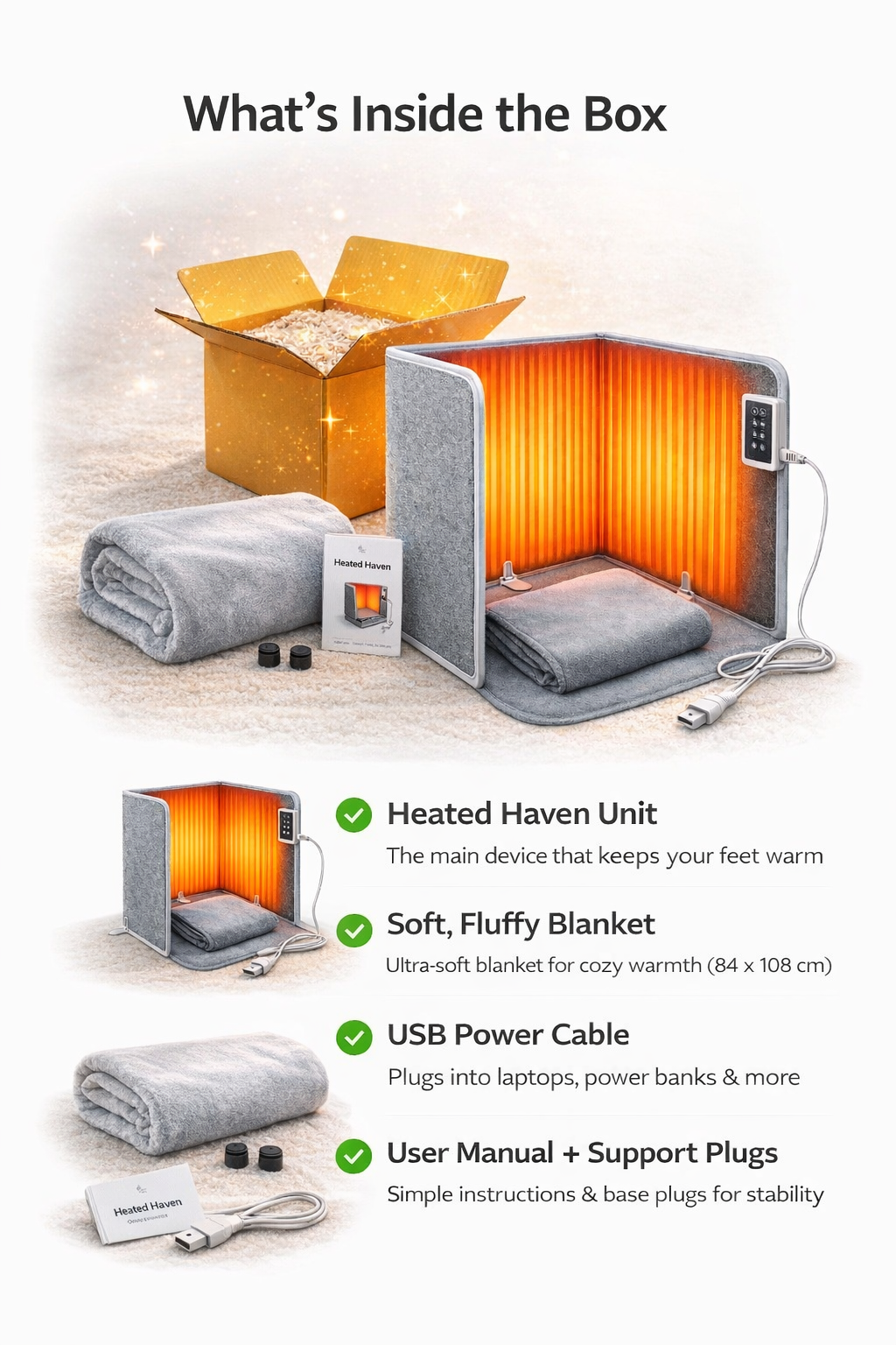 Heatedhaven includes everything you need for easy, comfy use, from the soft blanket and heating unit to simple setup instructions and base support plugs